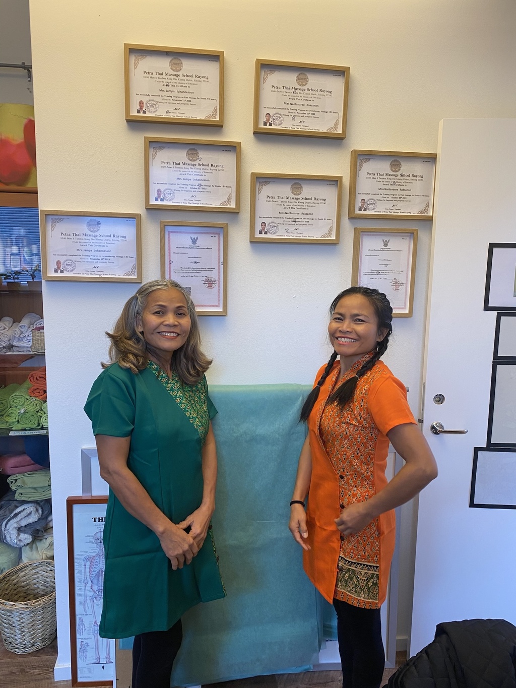 Salongen drivs av oss, systrarna Nantanaree och Jampa. Vi har 20 års erfarenhet i yrket och driver vår verksamhet enligt gamla traditioner, Nuad Thai, som sedan 2019 är erkänt som ett kulturellt världsarv hos UNESCO. Se länkarna
